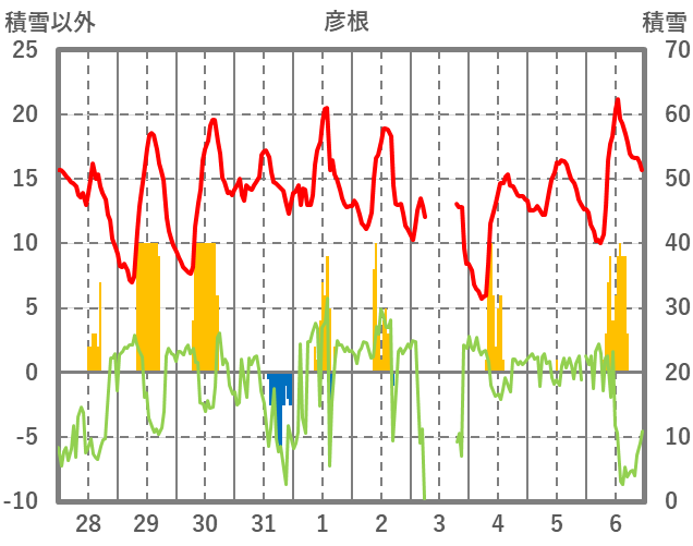 | 日 | 時 | 気温 | 降水 | 風向/風速 | 日照 | 積雪 | 降雪 |