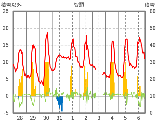 | 日 | 時 | 気温 | 降水 | 風向/風速 | 日照 | 積雪 | 降雪 |
