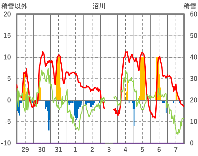 | 日 | 時 | 気温 | 降水 | 風向/風速 | 日照 | 積雪 | 降雪 |