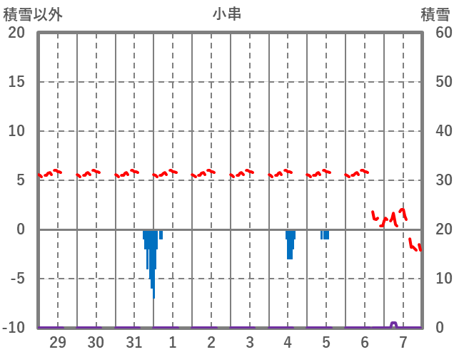 | 日 | 時 | 気温 | 降水 | 風向/風速 | 日照 | 積雪 | 降雪 |