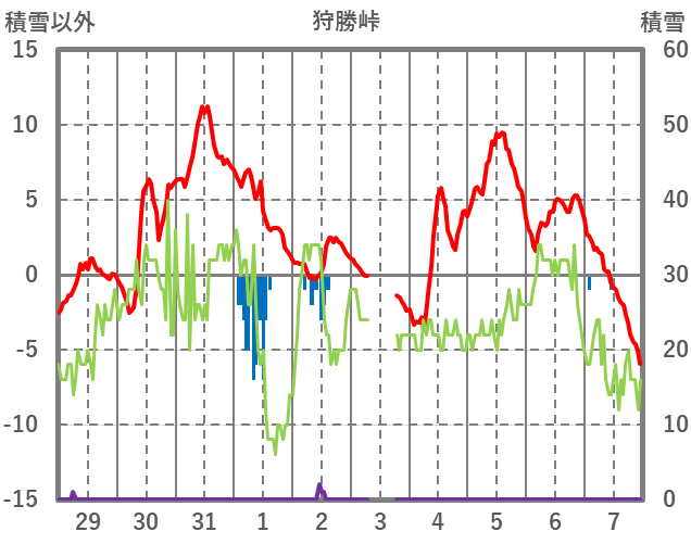 | 日 | 時 | 気温 | 降水 | 風向/風速 | 日照 | 積雪 | 降雪 |