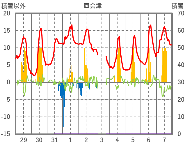 | 日 | 時 | 気温 | 降水 | 風向/風速 | 日照 | 積雪 | 降雪 |