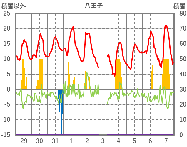 | 日 | 時 | 気温 | 降水 | 風向/風速 | 日照 | 積雪 | 降雪 |