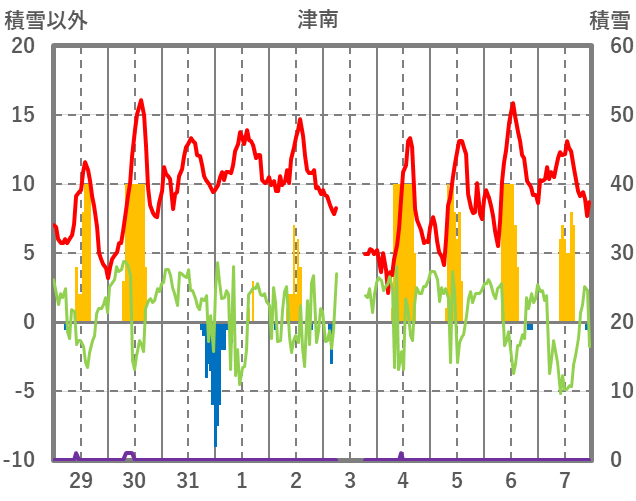 | 日 | 時 | 気温 | 降水 | 風向/風速 | 日照 | 積雪 | 降雪 |