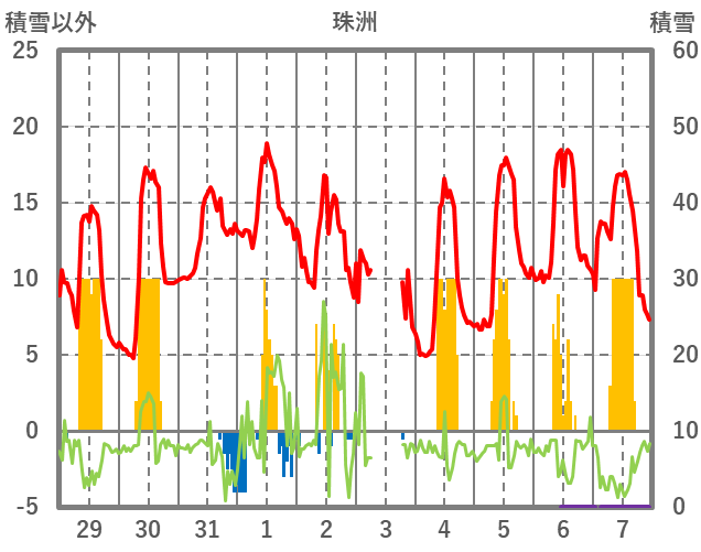 | 日 | 時 | 気温 | 降水 | 風向/風速 | 日照 | 積雪 | 降雪 |
