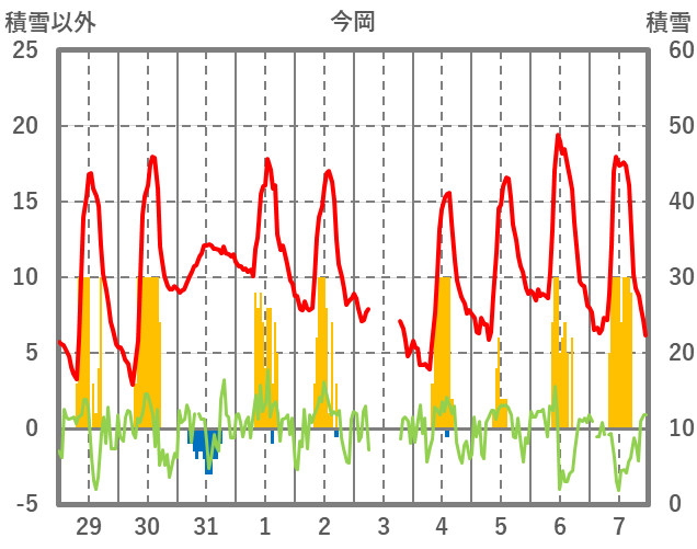 | 日 | 時 | 気温 | 降水 | 風向/風速 | 日照 | 積雪 | 降雪 |