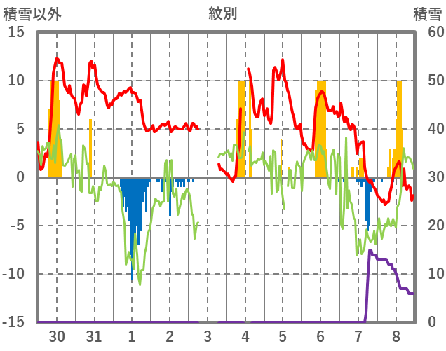 | 日 | 時 | 気温 | 降水 | 風向/風速 | 日照 | 積雪 | 降雪 |