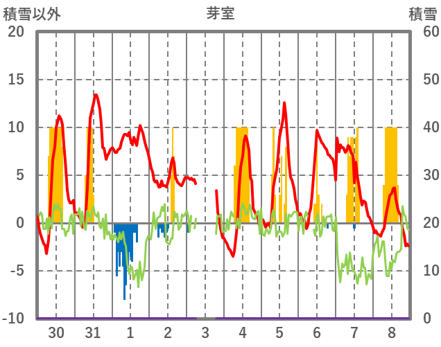 | 日 | 時 | 気温 | 降水 | 風向/風速 | 日照 | 積雪 | 降雪 |
