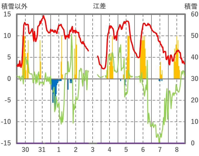 | 日 | 時 | 気温 | 降水 | 風向/風速 | 日照 | 積雪 | 降雪 |