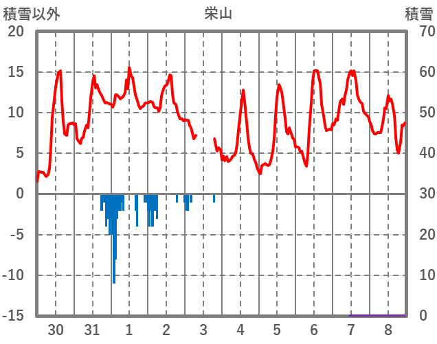 | 日 | 時 | 気温 | 降水 | 風向/風速 | 日照 | 積雪 | 降雪 |