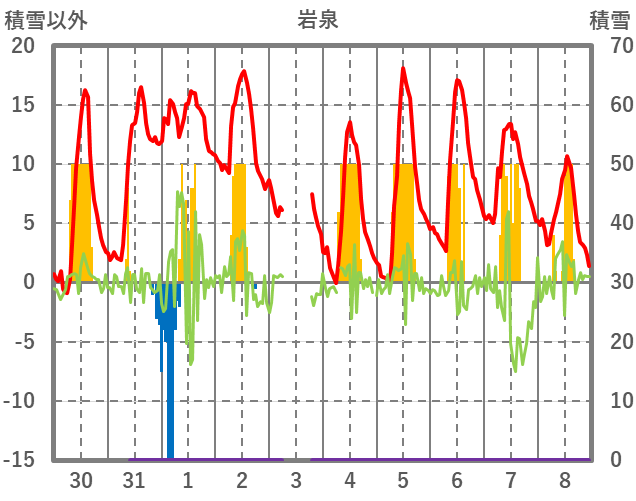 | 日 | 時 | 気温 | 降水 | 風向/風速 | 日照 | 積雪 | 降雪 |