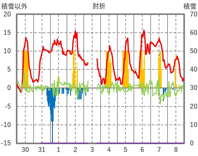 | 日 | 時 | 気温 | 降水 | 風向/風速 | 日照 | 積雪 | 降雪 |