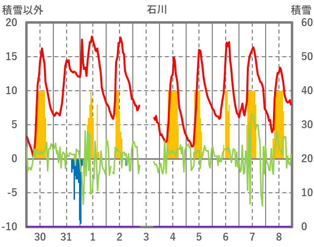 | 日 | 時 | 気温 | 降水 | 風向/風速 | 日照 | 積雪 | 降雪 |