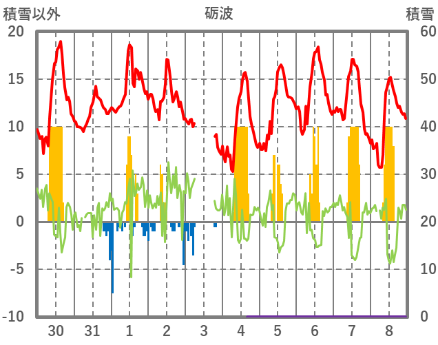 | 日 | 時 | 気温 | 降水 | 風向/風速 | 日照 | 積雪 | 降雪 |