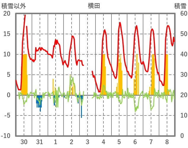 | 日 | 時 | 気温 | 降水 | 風向/風速 | 日照 | 積雪 | 降雪 |