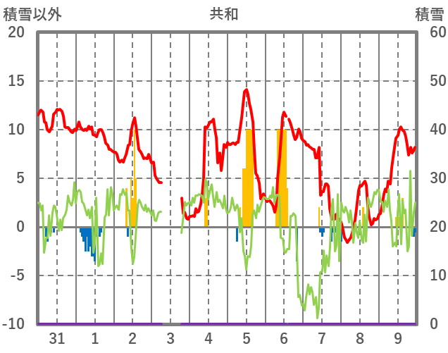 | 日 | 時 | 気温 | 降水 | 風向/風速 | 日照 | 積雪 | 降雪 |