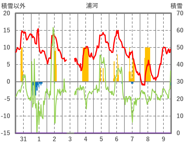 | 日 | 時 | 気温 | 降水 | 風向/風速 | 日照 | 積雪 | 降雪 |
