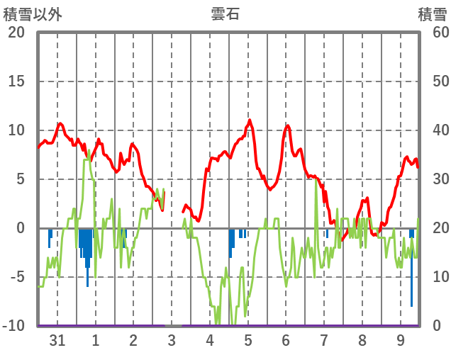 | 日 | 時 | 気温 | 降水 | 風向/風速 | 日照 | 積雪 | 降雪 |