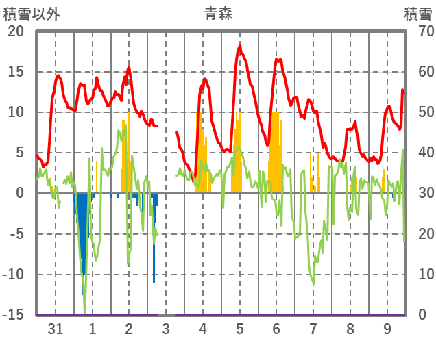 | 日 | 時 | 気温 | 降水 | 風向/風速 | 日照 | 積雪 | 降雪 |