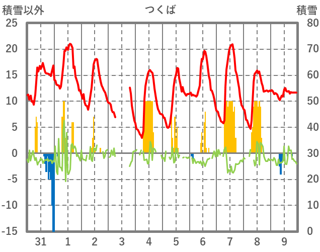 | 日 | 時 | 気温 | 降水 | 風向/風速 | 日照 | 積雪 | 降雪 |