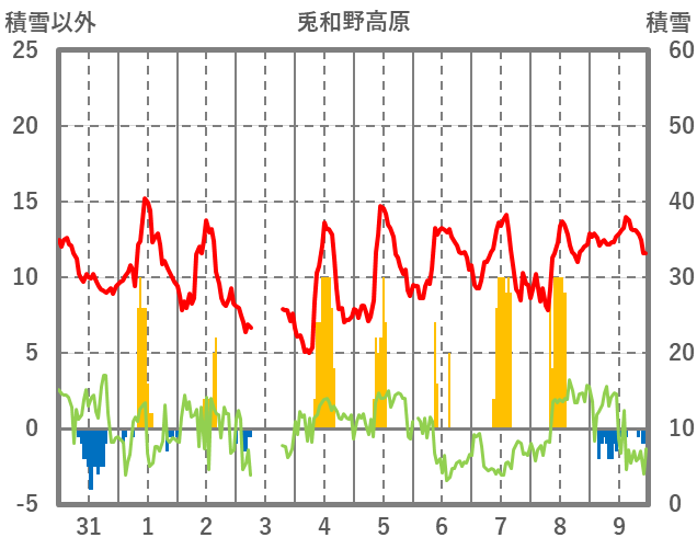 | 日 | 時 | 気温 | 降水 | 風向/風速 | 日照 | 積雪 | 降雪 |
