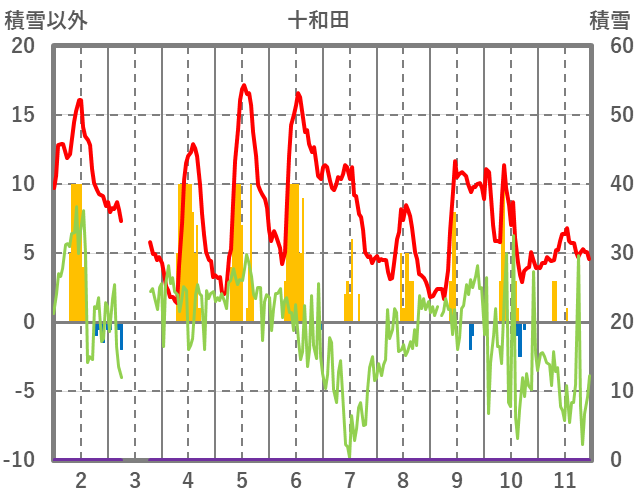 | 日 | 時 | 気温 | 降水 | 風向/風速 | 日照 | 積雪 | 降雪 |