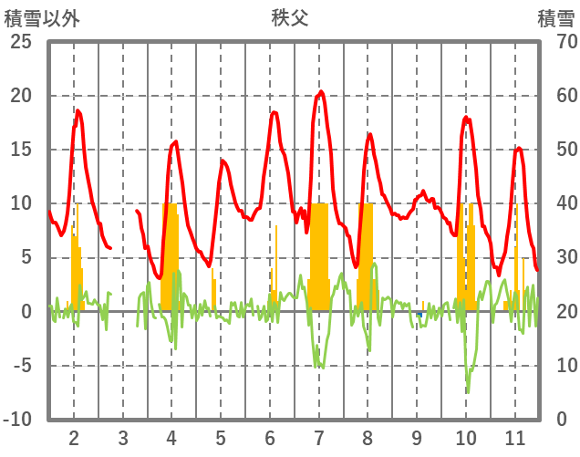 | 日 | 時 | 気温 | 降水 | 風向/風速 | 日照 | 積雪 | 降雪 |