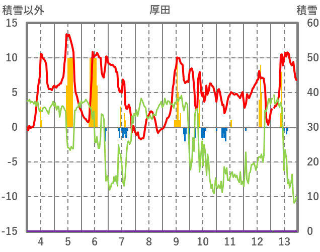 | 日 | 時 | 気温 | 降水 | 風向/風速 | 日照 | 積雪 | 降雪 |