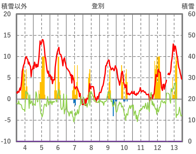 | 日 | 時 | 気温 | 降水 | 風向/風速 | 日照 | 積雪 | 降雪 |