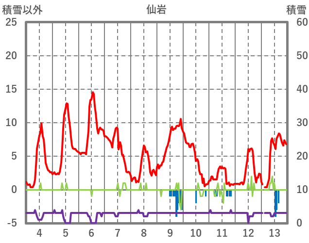| 日 | 時 | 気温 | 降水 | 風向/風速 | 日照 | 積雪 | 降雪 |