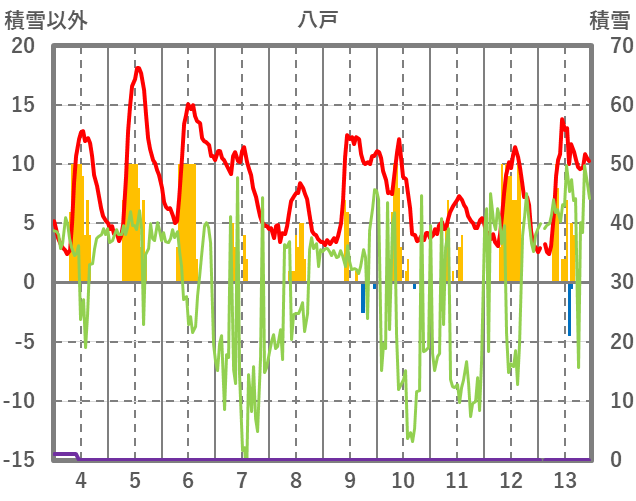 | 日 | 時 | 気温 | 降水 | 風向/風速 | 日照 | 積雪 | 降雪 |