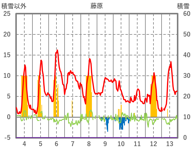 | 日 | 時 | 気温 | 降水 | 風向/風速 | 日照 | 積雪 | 降雪 |