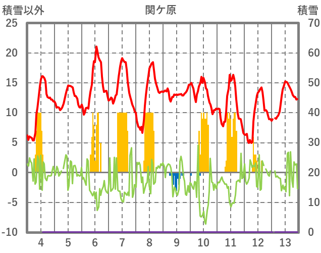 | 日 | 時 | 気温 | 降水 | 風向/風速 | 日照 | 積雪 | 降雪 |