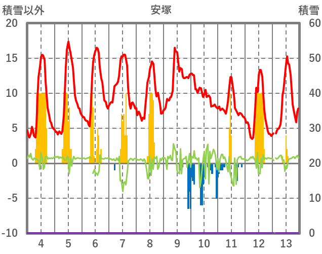 | 日 | 時 | 気温 | 降水 | 風向/風速 | 日照 | 積雪 | 降雪 |
