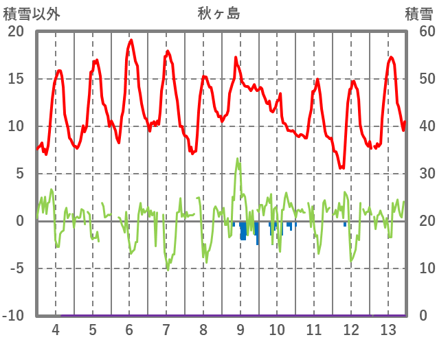 | 日 | 時 | 気温 | 降水 | 風向/風速 | 日照 | 積雪 | 降雪 |