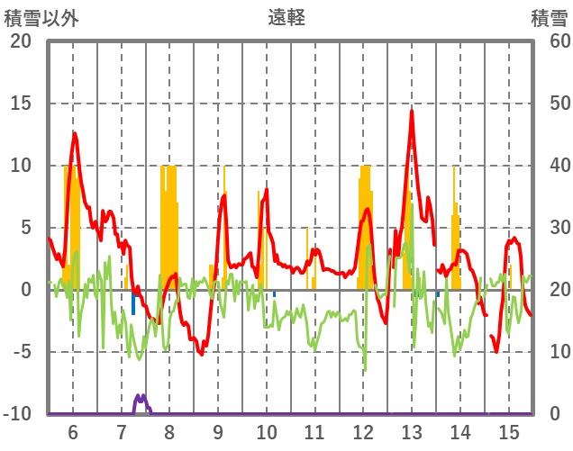 | 日 | 時 | 気温 | 降水 | 風向/風速 | 日照 | 積雪 | 降雪 |