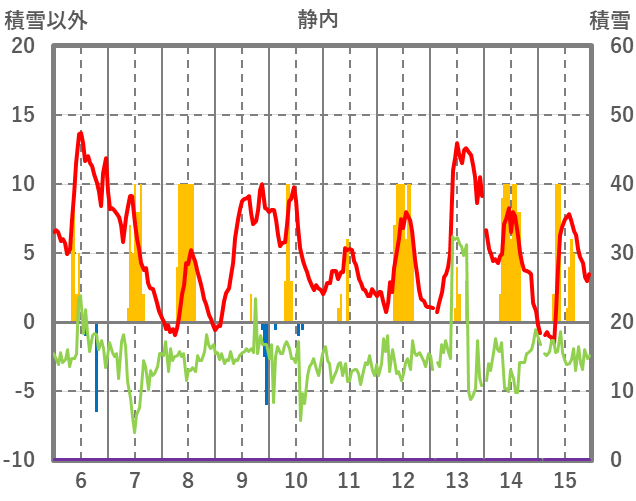| 日 | 時 | 気温 | 降水 | 風向/風速 | 日照 | 積雪 | 降雪 |