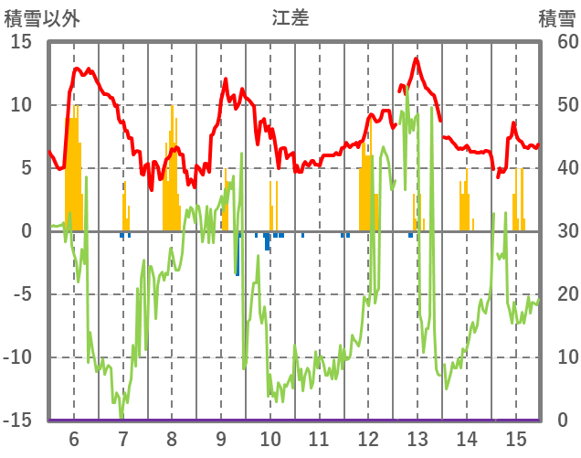 | 日 | 時 | 気温 | 降水 | 風向/風速 | 日照 | 積雪 | 降雪 |