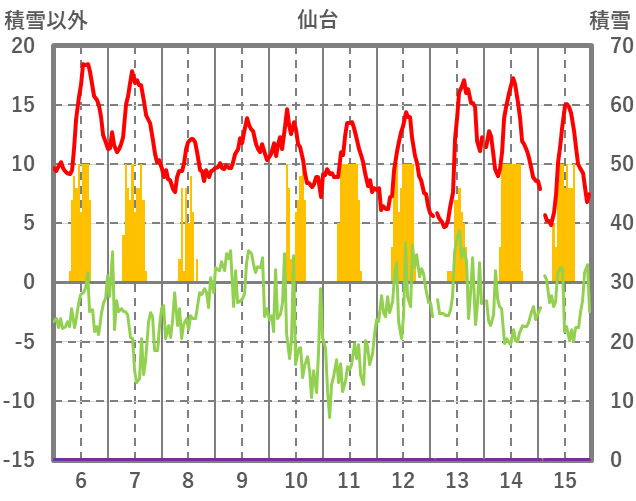 | 日 | 時 | 気温 | 降水 | 風向/風速 | 日照 | 積雪 | 降雪 |