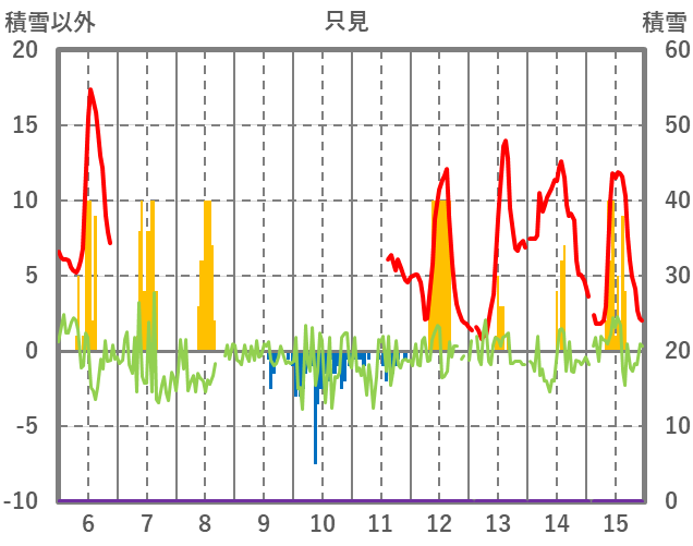 | 日 | 時 | 気温 | 降水 | 風向/風速 | 日照 | 積雪 | 降雪 |