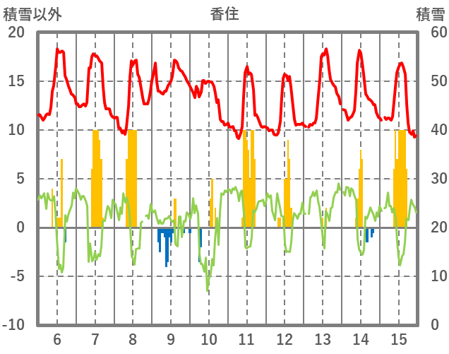 | 日 | 時 | 気温 | 降水 | 風向/風速 | 日照 | 積雪 | 降雪 |
