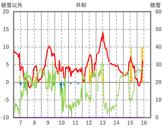 | 日 | 時 | 気温 | 降水 | 風向/風速 | 日照 | 積雪 | 降雪 |