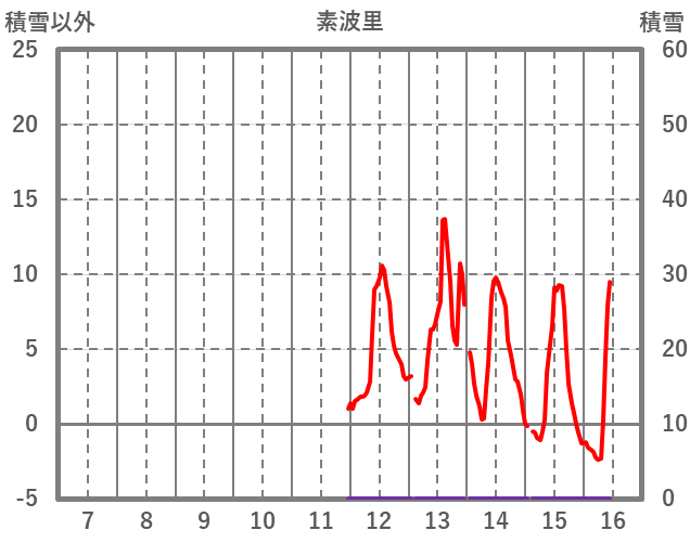 | 日 | 時 | 気温 | 降水 | 風向/風速 | 日照 | 積雪 | 降雪 |