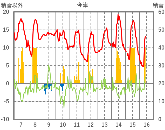 | 日 | 時 | 気温 | 降水 | 風向/風速 | 日照 | 積雪 | 降雪 |