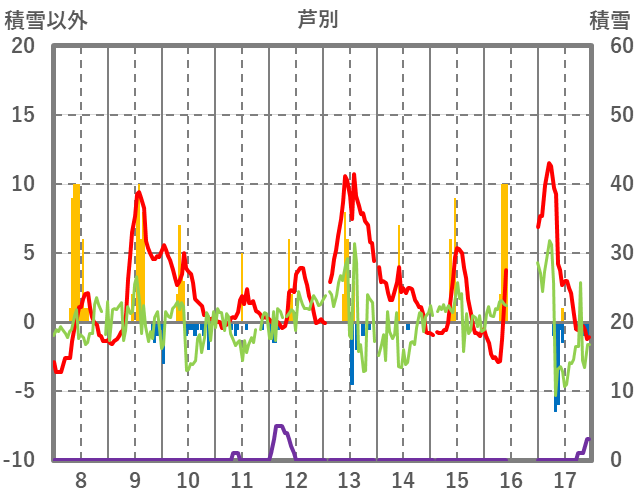 | 日 | 時 | 気温 | 降水 | 風向/風速 | 日照 | 積雪 | 降雪 |