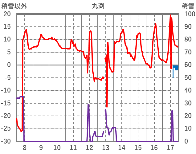 | 日 | 時 | 気温 | 降水 | 風向/風速 | 日照 | 積雪 | 降雪 |