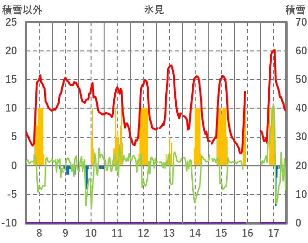 | 日 | 時 | 気温 | 降水 | 風向/風速 | 日照 | 積雪 | 降雪 |