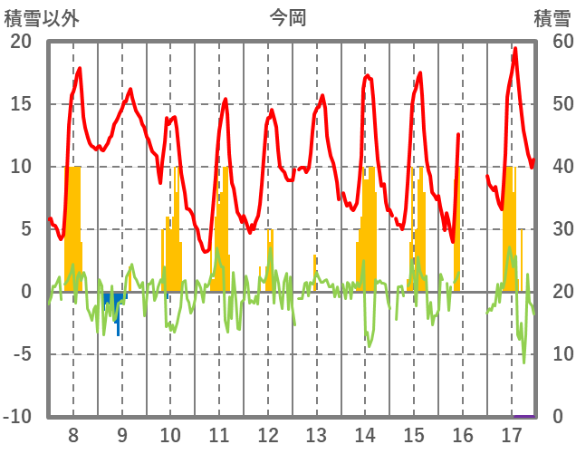 | 日 | 時 | 気温 | 降水 | 風向/風速 | 日照 | 積雪 | 降雪 |