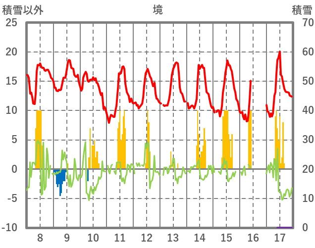 | 日 | 時 | 気温 | 降水 | 風向/風速 | 日照 | 積雪 | 降雪 |