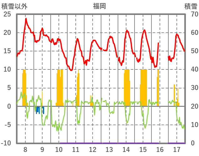 | 日 | 時 | 気温 | 降水 | 風向/風速 | 日照 | 積雪 | 降雪 |